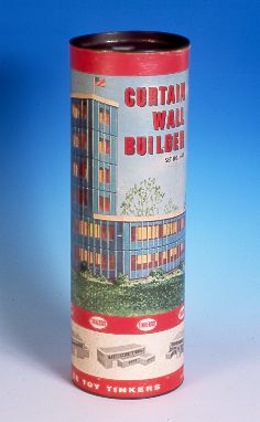 The third featured set is Curtain Wall Builder, a 1950's american toy which builds modular flat roofed office buildings and the like. The walls are built up from metal components in three lengths and two styles, along with internal and external corners. The only other major part is a plastic double door. Cut-to-fit carboard roofs then sit on top, supported by plastic wall capping parts. See the Curtain Wall Builder page for more information, including an illustration of the various parts. |