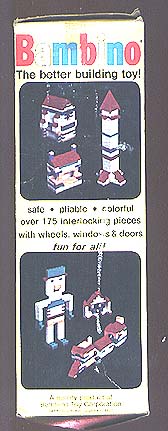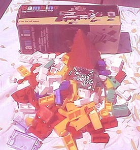 Plastic bricks in various colours with square studs for interlocking - generally one or two stud bricks. Includes anged roof bricks, windowns and doors and also wheels. Moulded one piece pyramidal roof also included.