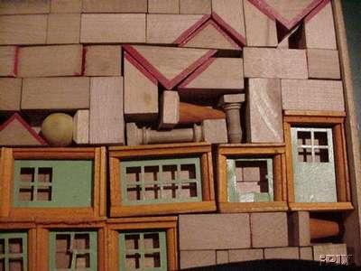 Largish scale, plain wooden stacking blocks, with punched metal windowns and doors set in wooden frames, angled bricks for roofs with the angled face painted red, plus turned chimney pots and pinnacles. It would appear that the set is intended not so much for the construction of entire houses but rather for facades only.
