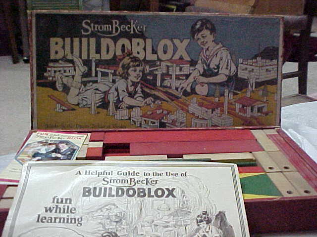 Wooden stacking blocks, primarily rectangular but with some angles, the latter coloured. Red slats are provided for roofing.