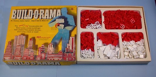 Small square and rectangular red and white plastic panels which connect together by means of holes and projecting studs on the sides. Red and white window and door panels connect in the same way.