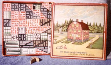 Wooden stacking blocks with embossed architectural details on both sides. Wall blocks in square, half square and triangular shapes have a red brick design on one side and a black and grey timbered design on the other. Square and rectangular blocks offer other details such as doors and windows, in green and white, and steps, lantern and date inscription (1907) in black and white. Presumably card was supplied for the roof.
