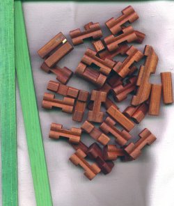 Wooden logs with cut outs to allow interlocking at corners. Logs differ from many sets in