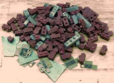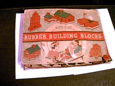 Red rubber bricks with stud and socket connection between the rows, with hinged green rubber roofs and printed card windows and doors. Essentially the same as