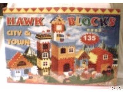 Large coloured foam parts with crenellated edges to allow them to fit together. Each part forming a wall with window or door apertures. Similar parts form the roofs, with triangular gable pieces. Other than in material, very similar to Wee Waffle Blocks.