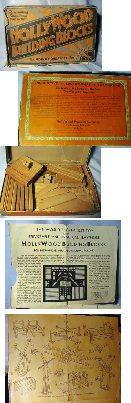 Wooden square cross-section blocks with longitudinal grooves in centre of sides into which fit thin, mostly rectangular, slats. Both blocks and slats come in a variety of sizes.