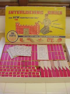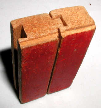 Wooden bricks, painted red on outer face, which interlock between rows by means of a bevelled tongue on the upper face and corresponding groove on the lower (see picture below). As well as various length bricks there are also angled gable bricks and printed card windows and doors. A folded card sheet provides the roof.