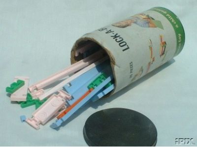 Flat plastic notched plates in various colours which build in the same way as a number of wooden sets such as