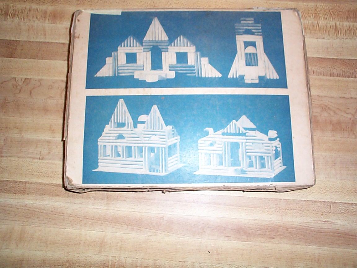 Wooden blocks, with a pattern of parallel grooves to simulate stacked circular cross-section logs. Blocks are in a vareity of shapes: rectangular, triangular, arched, semicircular. Roof is a piece of folded printed card.