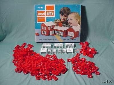 Red plastic bricks with square studs for interlocking rows. The bricks have no top surface so from above appear as frames rather than solid bricks. The are made from a very hard plastic and do not bind together. The sets include white windows and doors and card sheet roof.