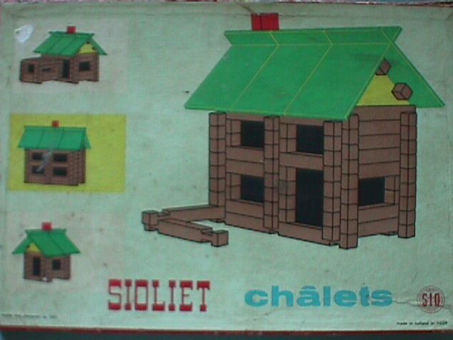 Square cross-section brown wooden logs of various lengths with cut-outs to allow cross linking. Yellow gable boards sit in grooved top logs and support cross beams which support green roof parts. These are pairs of flat plates, each with a half length slot, which fit together. More or less pairs are used depending on the building length. A red chimney with a V shaped base sits in the roof.