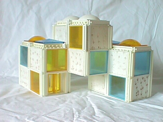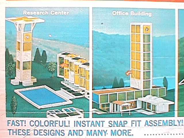 Plastic frames which connect together at the edges with grooves and studs into which fit a variety of wall panels. Frames can be connected together at right angles by grooved and flanged columns. Frames are primarily square with some rectangles (half squares) and triangles (diagonally halved rectangles). The inserts are mostly wall finishes in either thin textured and coloured opaque plastic or windows in coloured (and sometimes textured) transparent plastic. There are a few card inserts, generally with printed signs. In addition there are a variety of special inserts and frames, including shop windows, bow window, house door with pillars, clock, flag pole, garage door, revolving door etc. There are also balconies and canopies. Other cardboard parts include helicopter pads and 'building extenders'. Roofs are generally intended to be flat (some of the plastic inserts are domed or pyramidal roof lights and panels) but card roofs are supplied for more domestic buildings.
