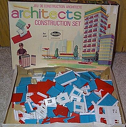 Various plastic wall panels with studs top and bottom which connect into holes in longer beams. Panels come plain or with various door or window patterns. Flat base and roof panels have studs one one side (at corners only) whilst panels for intermediate floors have studs on both sides (also at corners only). Balconies and flower boxes clip on to wall panels.