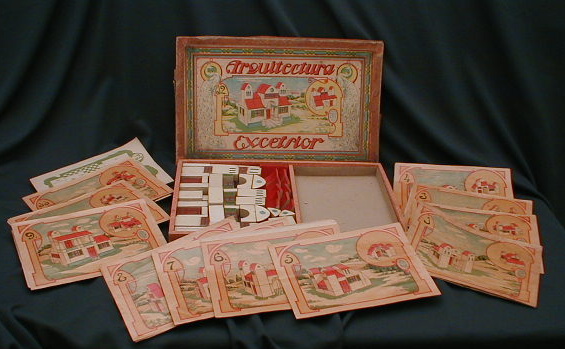Stacking blocks covered in printed paper showing finely detailed art deco style architectural features.