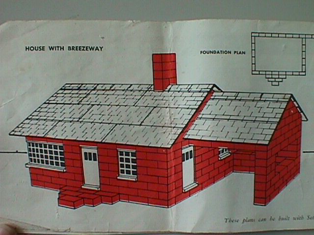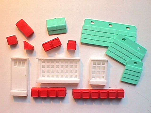 Red plastic bricks with square interlocking studs on top and textured sides. Bricks come in one, two, four and six stud lengths. All the four and six stud bricks and some of the shorter bricks have a different edge texture from the rest and are intended to be foundation bricks. Sets also include angled gable bricks and stud-less wall capping bricks. Doors and windows are white and, excluding the two part corner window, openable. Three sizes of green roof sections plus ridge pieces have stud and hole connection.