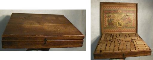 Wooden slats with notches on upper and lower edges to permit interlinking at corners, along the lines of