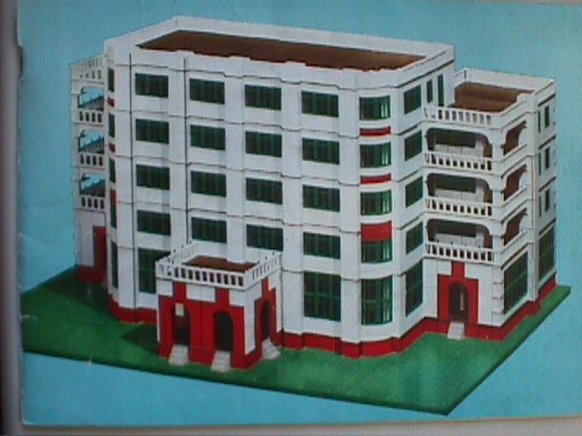 Plastic wall sections which fit between upright metal rods fitted into a plastic baseboard. These sections comprised a variety of brick effect wall pieces including corner parts, doors, various sized windows, curved windows and wall parts and various special parts whose availability varied over the years. The more standard of these parts included arches, columns, beams to span larger spaces, garden fencing / parapet edging, bay window and porch roofs, and three tread steps. Other less common parts included dome and pinnacle roofs and crennellated battlement sections. Later sets had garage doors and telvision aerials. Early roofs were one piece mouldings whilst later ones came in two flat parts plus two gable ends. Roofs came in a range of sizes and the one-piece roof range included a gabled add-on roof. Chimneys were supplied to sit on top. Thin plastic sheets in various sizes with holes for the rods around the edges allowed for flat roofs or internal floors. Metal tie parts could be included after each storey to help keep the rods the correct distance apart and the building stable.