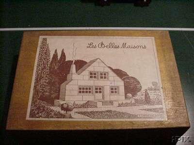 Largish scale, plain wooden stacking blocks, with punched metal windowns and doors set in wooden frames, angled bricks for roofs with the angled face painted red, plus turned chimney pots and pinnacles. It would appear that the set is intended not so much for the construction of entire houses but rather for facades only.