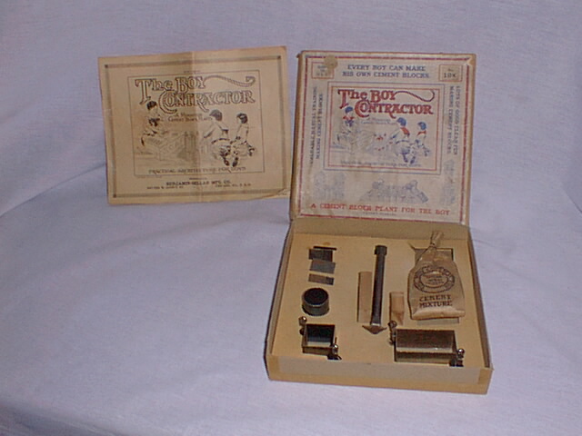 Metal moulds in a number of shapes, with cement powder, for making building blocks.