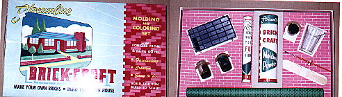 Set comprises a flexible rubber mould for making full and half bricks and angled gable bricks, moulding power and a glass water measure. For the finished bricks there is a file to finish off rough edges, glass bottles of red and green paint plus glue and a brush. Thick card windows and doors are supplied as are green tile effect paper and thick card to make roofs.