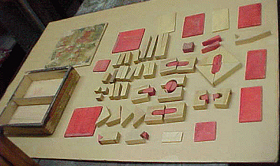Rather nice stacking blocks in white and pink, with a variety of arched and angle blocks and hinged roofs.