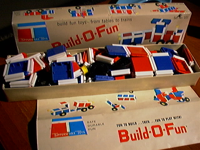 Not specifically an architectural toy, but can be used as such. Comprises red and blue square plastic panels, connected together at the edges by white square cross-section rods. The rods have grooves down the sides into which slide a beaded lip on the edge of the panels. Wheels are also provided.