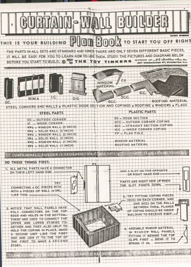 Painted metal wall section fit together by means of slots and tabs on the ends and studs on top and holes on the bottom. Section come in three lengths, either with or without windows. Windows are glazed with yellow tinted plastic. Internal and external corner wall parts are also supplied. Doors are separate plastic units which clip to the walls on either side and have two hinged swing doors. Walls are capped with plastic sections which support the cut-to-size card roofing. Plastic flag poles can be pushed into the roof.