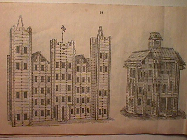 Wooden slats of various lengths with half cut-outs at regular intervals which allow cross-linking. Most parts are rectangular but a few have shaped ends or semicircular cut-outs on one edge. The parts do not look particularly architectural but the box lid and instructions (See below) show a delightful variety of somewhat stylised buildings.