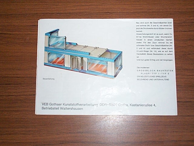 Hard white plastic wall panels with studs top and bottom which connect together by means of softer blue plastic beams with holes. Flat red panels wiht studs at the corners form the roof and similar ones in white with studs on both sides form the intermediate floors. Wall panels come in a variety of designs, including different windows and doors. Green balconies clip onto windows. There are also large clear shop windows and a rather complicated set of parts including a small window and triangular wall pieces to allow the construction of gabled roofs. Trees, animals, parasols and chimneys are also included.