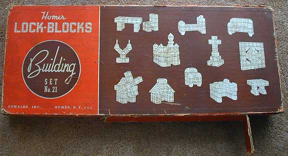 Wooden building blocks with angled grooves on each face. These take thin slats which allow the blocks to be locked together rather than just stacked. Shapes include cubes, triangular, pyramidal, curved and octagonal.