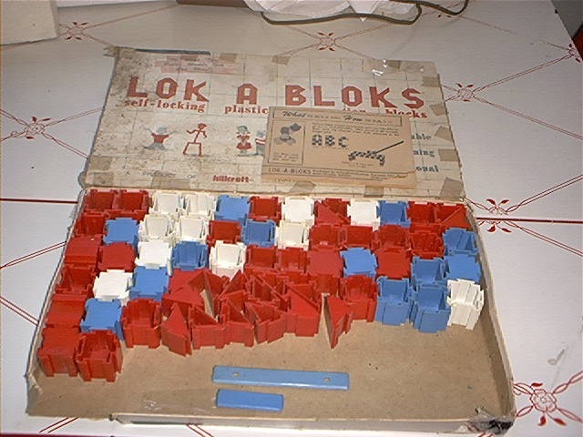 These are square and triangular blocks with bevelled projections on two sides and matching bevelled slots on two others to allow blocks to slot together (see third picture below). Earlier blocks were in wood but later they were made of hollow plastic in red, white and blue.