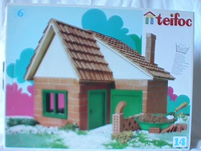 Terracotta bricks held together with mortar (powder supplied) which can be seperated for re-use by soaking in water. Opening plastic windows and doors, including garage door. Wooden roof boards are supplied onto which are mortared terracotta tiles, either pantile-effect or simple flat curved-end ones, and ridge tiles. Wooden gable boards are also supplied, but there are also two angles of gable bricks. Long flat terracotta 'beams' are included in some sets and can be used for roofs, either as they are or tiling on top. Wooden beams which can be used to support roofs over terraces for example are supplied too. There are a variety of odd shaped or decorative bricks which can build things like garden walls, arches, porches or wells!